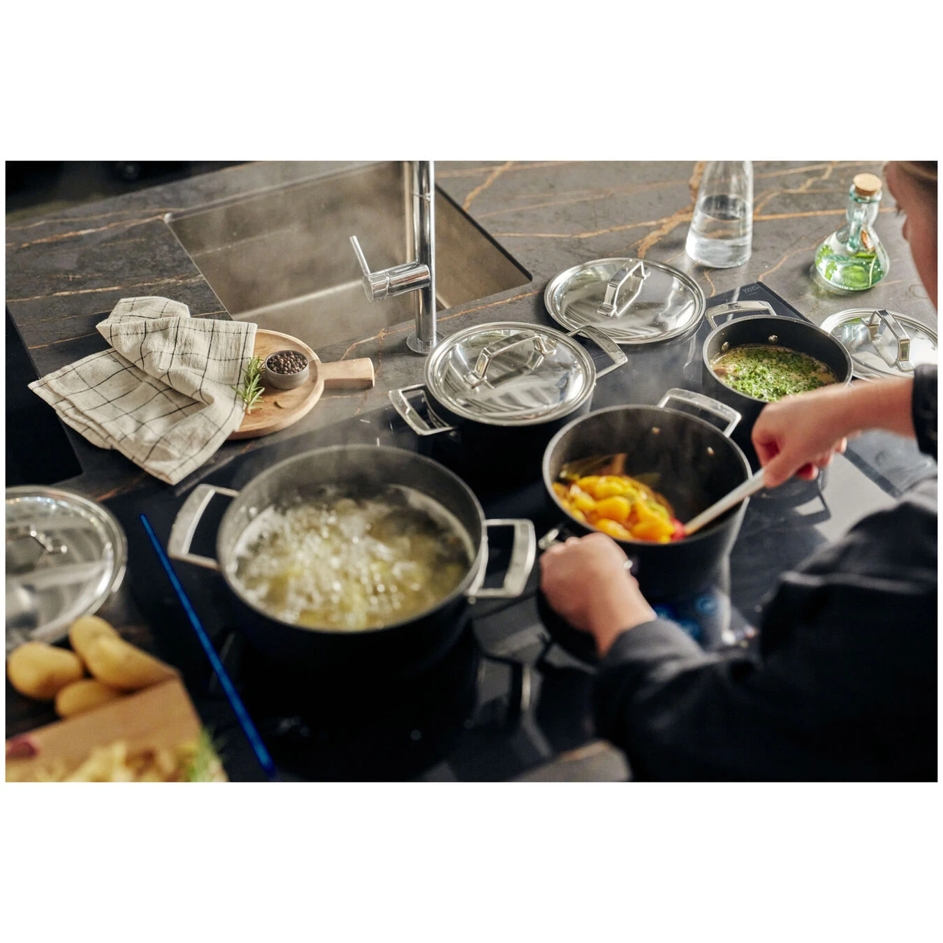 Rijst, boontjes, pasta, … koken, ui fruiten, groenten aanstoven … Voor de dagelijkse basisbereidingen kan je rekenen op deze eenvoudig te hanteren Alu Pro 5 kookpotten van 16, 18, 20 en 24 cm. Licht qua gewicht, maar niet qua prestaties. De body in gesmeed aluminium is extra dik en meer dan stevig. Dankzij de unieke Radiant bodem is en blijft je pot extra stabiel en in optimaal contact met de kookplaat. De warmte wordt egaal verspreid. De exclusieve TriplInduc® technologie presteert perfect op inductie. Je hebt tot 30% minder energie nodig voor dezelfde temperatuur. Deze potten reageren supersnel zodra je overschakelt naar een andere fornuisstand. De potten zijn ook even snel weer op de juiste temperatuur nadat er koude ingrediënten, zelfs recht uit de koelkast, in gaan. Geschikt voor alle kookplaten, zeker voor inductie. Ook bijzonder aan deze kookpot: de duurzame Duraslide Titanium® antikleeflaag verhindert dat ingrediënten aan de bodem blijven kleven of aankoeken. Bovendien maakt die de potten nog sterker en extra duurzaam. Gebruik enkel accessoires van silicone of hout, om beschadiging te vermijden. Het stijlvol vormgegeven deksel past perfect. Hierdoor blijven warmte en stoom beter bewaard en verspil je geen energie. Het deksel is net als de stevige grepen vervaardigd uit roestvrij staal met Silvinox®. Je maakt het in een-twee-drie schoon en het blijft blinken. Bovendien contrasteert het prachtig met de matzwarte potten in gesmeed aluminium.